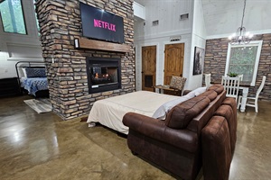 Step inside to an open-concept living area with a farmhouse feel, featuring a fully stocked kitchen with everything needed to prepare delicious meals together. Enjoy cozy evenings by the fireplace that serves both the living room and the bedroom. The dining table provides a perfect space for meals or games, and the cabin also features streaming TVs in every room, including the living room, bedroom, and even the bathroom!