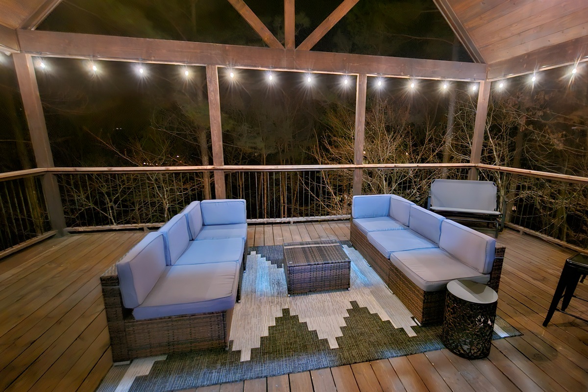 The upstairs game room is a favorite for kids and adults alike. Enjoy a game of pool, challenge friends to a round on the retro arcade console, challenge each other at a game of pool, or dive into the collection of board games and cards. The room opens to a second covered deck with ceiling fans and string lights, creating a magical setting for evening relaxation.