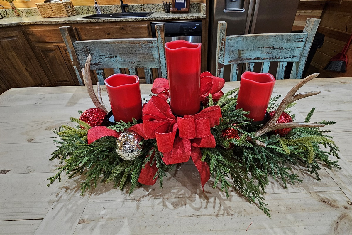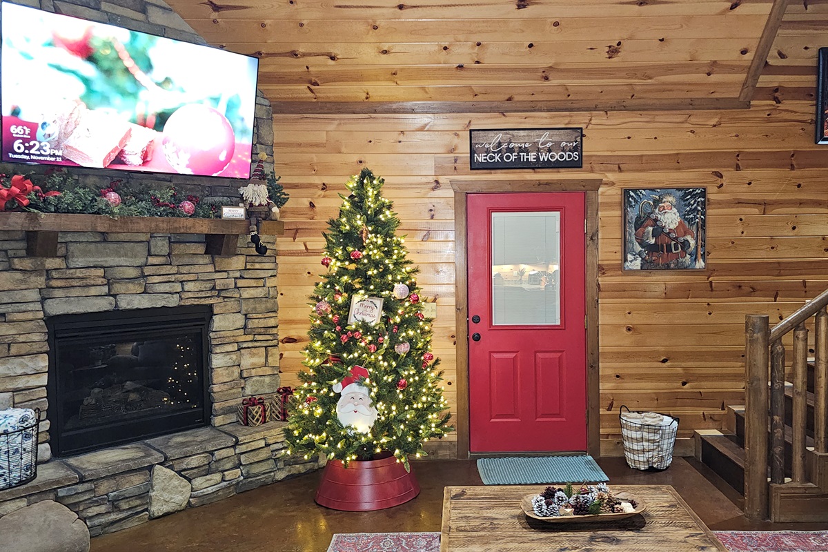 Inside, the cabin features three spacious king bedrooms, each designed with cozy comfort and rustic furnishings. Two bedrooms and two bathrooms are located on the main level, while the third bedroom and bathroom are upstairs.